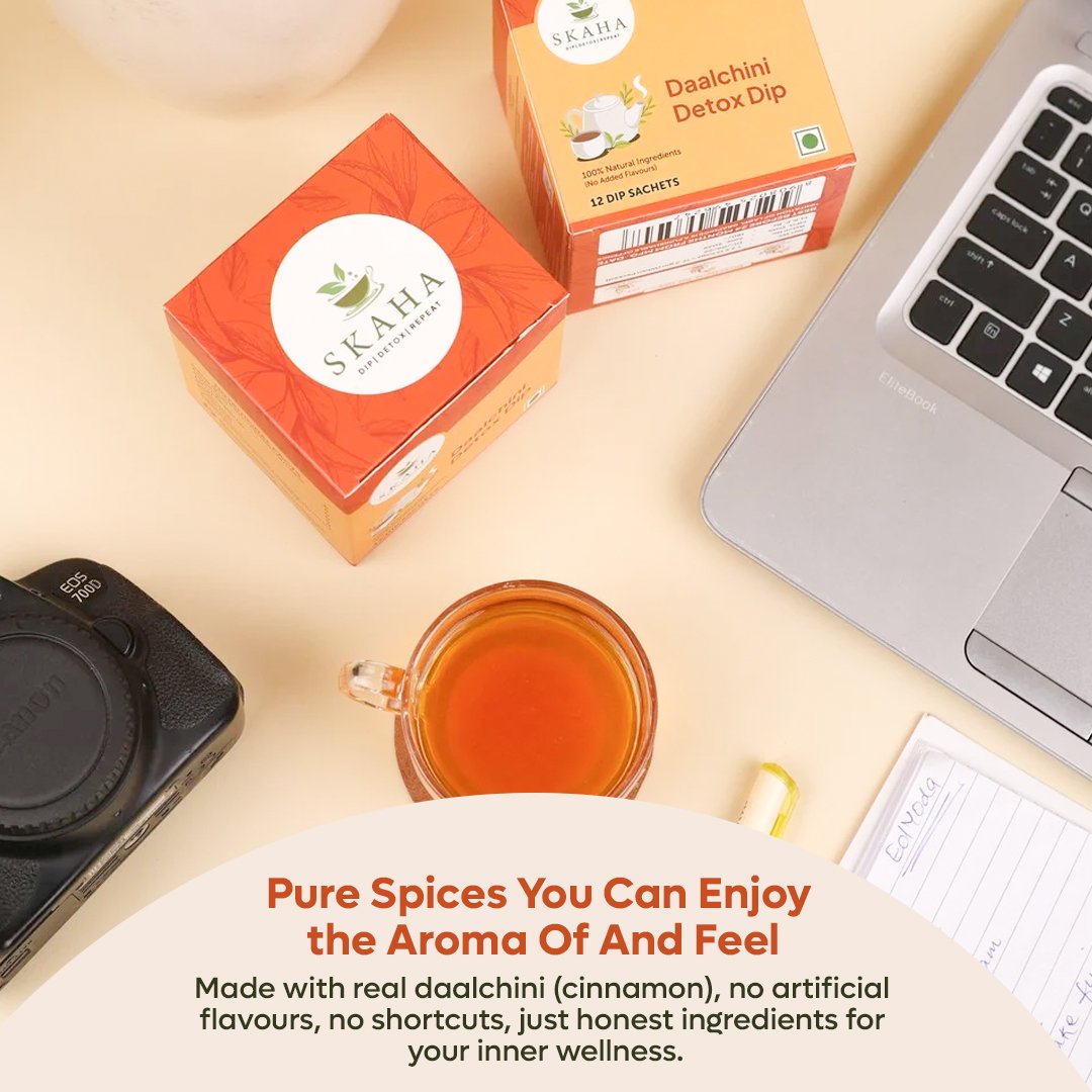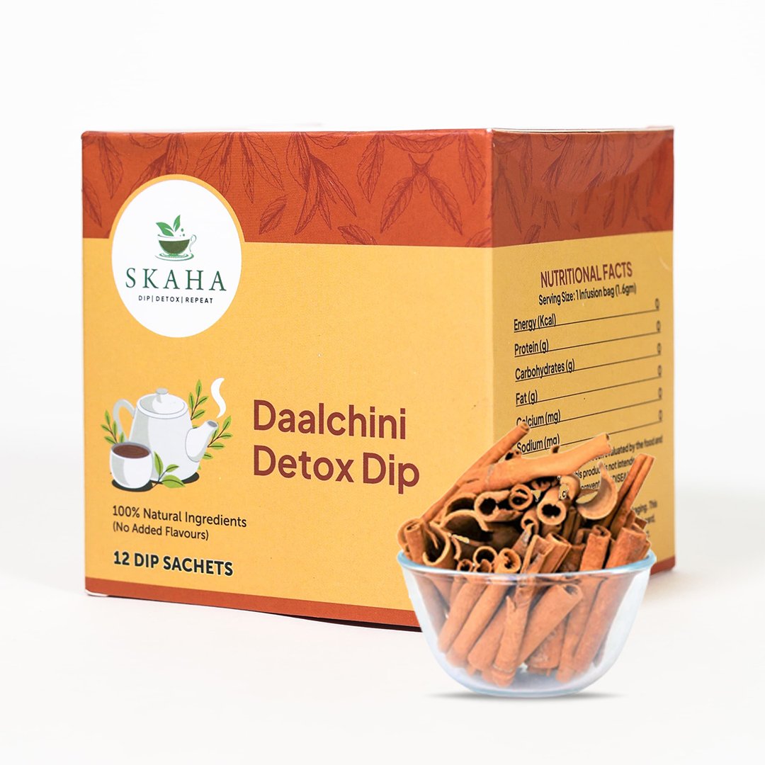 Beat the afternoon slump and glow from within with Skaha Daalchini Detox Tea, the perfect antidote to your 4 PM cravings and dull, tired skin. Cinnamon is one of nature’s most aromatic spices, prized not just for its flavor but for its rich antioxidant profile, which helps combat oxidative stress and supports natural skin vitality.