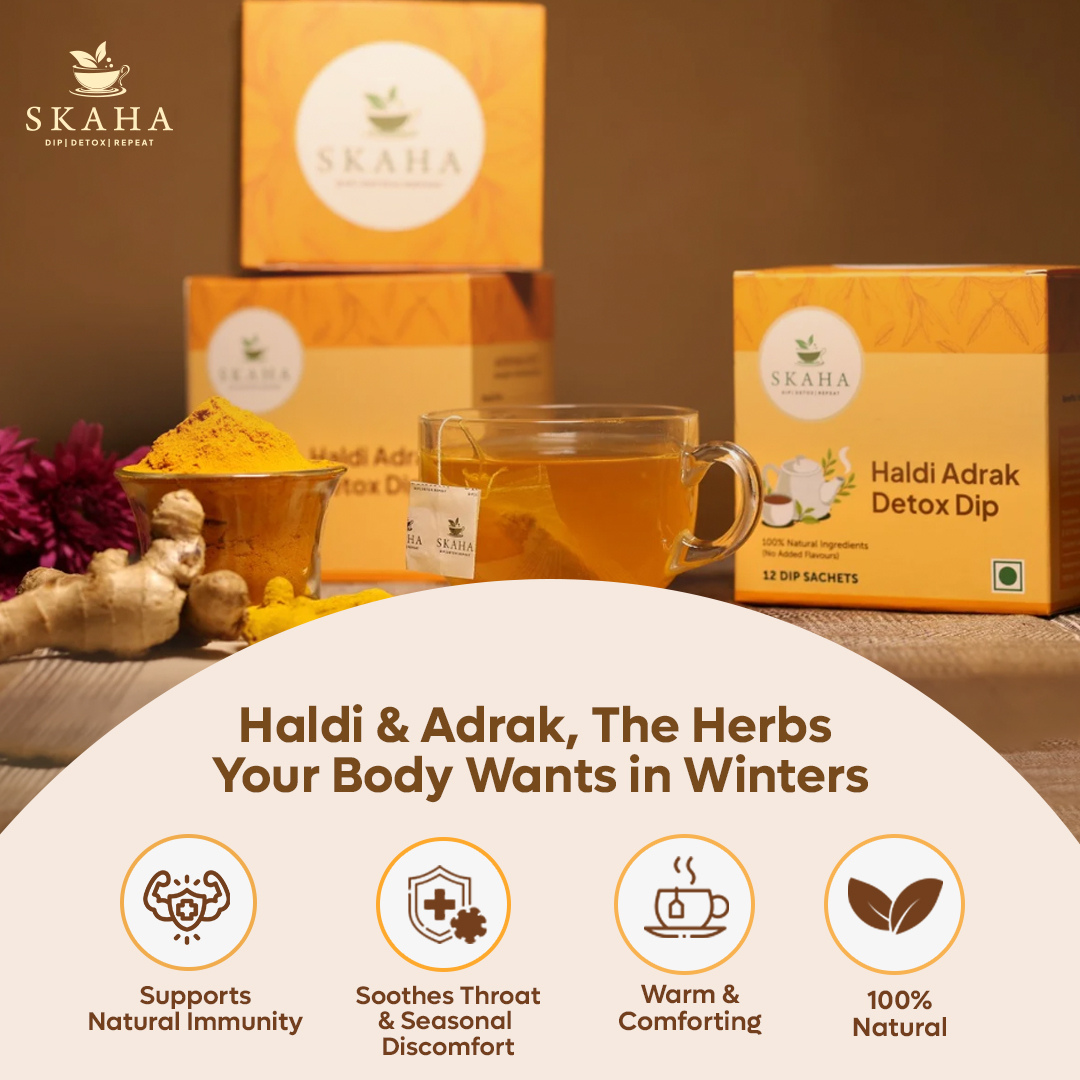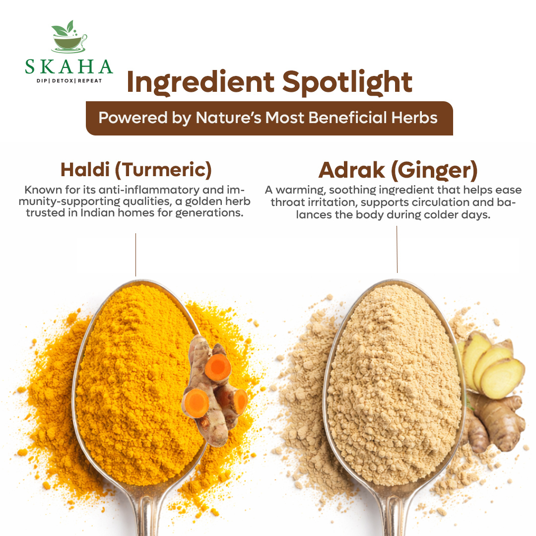 Experience the “Golden Brew” reimagined for your busy life. Skaha Haldi Adrak Detox Tea brings together two iconic healing herbs of India: Haldi (Turmeric) and Adrak (Ginger). Traditionally consumed as kadhas or golden milk, these ingredients are world-renowned for their anti-inflammatory and immunity-boosting properties.