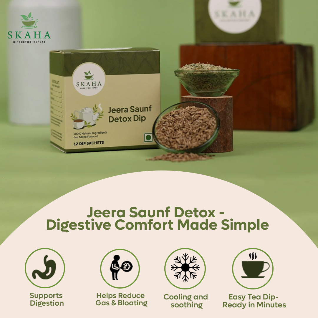Skaha Jeera Saunf Detox Tea combines the digestive power of Jeera (Cumin) and Saunf (Fennel), two of India’s most time-tested kitchen staples. For generations, these seeds have been chewed after meals to spark digestion and refresh the palate.