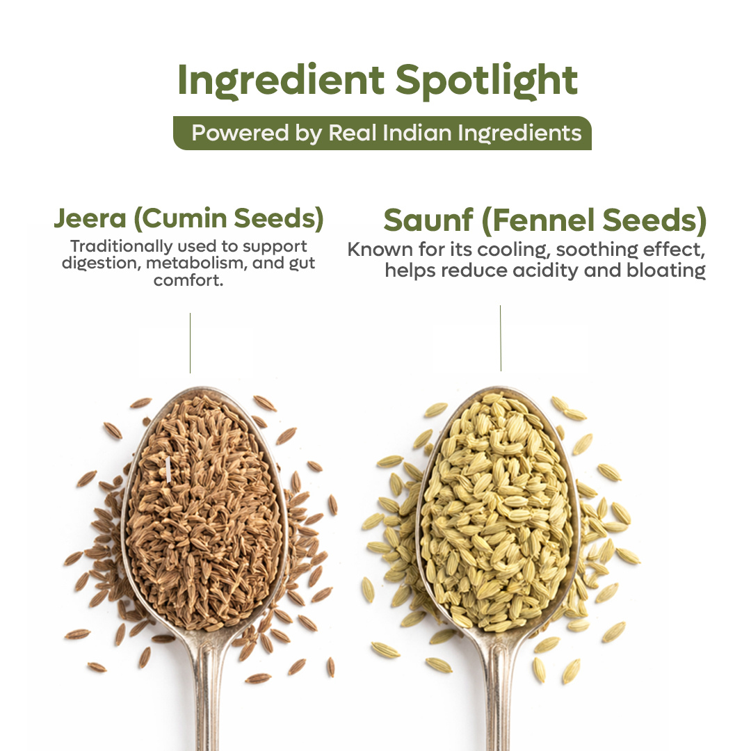 Anti-Bloating & Gas: The carminative properties of Jeera and Saunf work together to ease trapped gas and acidity.