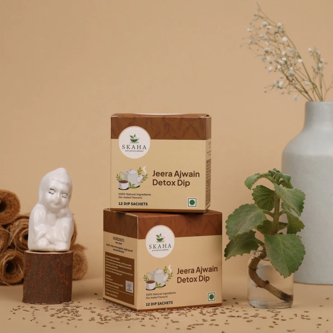 Skaha detox teas typically use Ayurvedic-style ingredients like jeera (cumin), ajwain, saunf (fennel), methi (fenugreek), haldi (turmeric), and adrak (ginger), and these herbs work synergistically to support both metabolism and blood sugar balance.